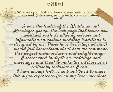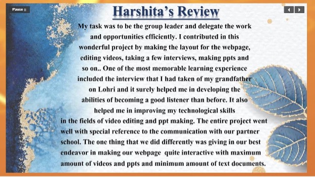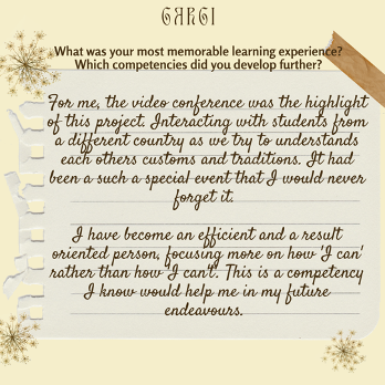 Through this project we learned team work, punctuality, computer skills and also gained some general knowledge. We also understood the importance of our family and family members. How they are always standing behind us to guide us and show us our mistakes where ever needed. We enjoyed communicating with our partner school.