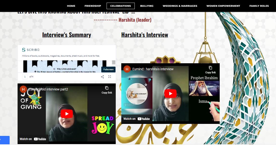 Mitali- working on Bullying for the Eumind project has truly been an amazing experience. It taught all of about the damage bullying causes in the current age. Interacting with the students bought us insight on their experiences with their subject and what goes through a bullying victims mind.It also taught me effective ways to prevent and eradicate bullying from the society.